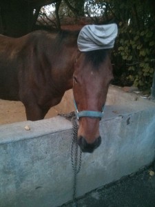 Bis ich in die Sattelkammer komme und meinen Helm sehe. Freue mich sehr, jemand hat an die armen Rennreiter gedacht und mir einen hübschen Bezug für meinen Rennhelm geschenkt! Cool!